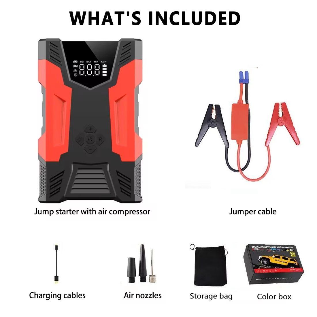 Feature highlights:The 4-in-1 Multi-Function Jump Starter combines a car jump starter, power bank, SOS light, and tire inflator with a built-in air compressor. Featuring a Grade A high-rate lithium polymer battery, it delivers a peak current of 1500Amp, suitable for 7.0L gasoline and 5.0L diesel engines. The air compressor provides a maximum pressure of 150 PSI with automatic shutoff and real-time digital display. It includes USB outputs for device charging and three inflatable needle types for versatility in inflating cars, motorcycles, air mattresses, and balls.
